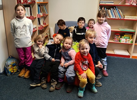 V pátek 6. 3. 2026 jsme zamířili do místní knihovny, kde nás mile přivítala paní knihovnice, paní Selingerová, která dětem poutavou formou ukázala, „kde knihy spí“. Děti se dozvěděly, jak jsou knihy v knihovně uspořádány, kdo je píše a odkud se berou obrázky v nich. Měly také možnost vyzkoušet si samotné zapůjčení knihy, což byl pro mnohé velký zážitek. Tímto bychom chtěli poděkovat paní Selingerové za milé přijetí a umožnění návštěvy knihovny.
