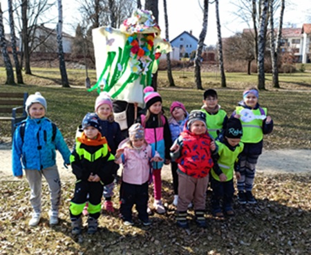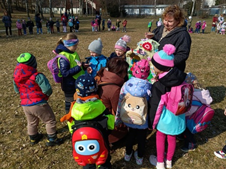 V pátek 20. 3. 2026 jsme se s dětmi vydali na výlet do ZŠ Slavonice, kde jsme se zapojili do krásné jarní tradice – vynášení Morany. Po příjezdu autobusem jsme nejprve navštívili základní školu. Pod vedením paní asistentky Strašákové si děti vyrobily veselé jarní motýlky a zároveň se dozvěděly zajímavé informace o Moraně, která již byla připravená. Sešli jsme se v hojném počtu – do akce se zapojily jak děti z mateřské školy, tak i žáci základní školy Slavonice. Po svačinové pauze jsme se všichni společně vydali v průvodu do parku. Zde proběhl samotný akt vynášení Morany, symbolu zimy. Jednotlivé třídy se postupně zapojily do její proměny – Moranu jsme společně „přestrojili“ za jarní Vesnu pomocí zdobení trávou, květinami a barevnými motýly. Celou atmosféru ještě více zpestřil čáp kroužící nad našimi hlavami – jako by nám sám potvrdil, že jaro už je opravdu tady. Děkujeme paní Strašákové za pozvání, poskytnutí zázemí i krásně připravený program. Budeme se těšit na další společná setkání.